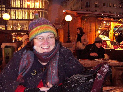 Mum sitting in the snow at the Budapest Christmas Market - see the beaded necklaces at the stall in the background?