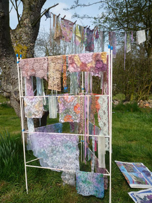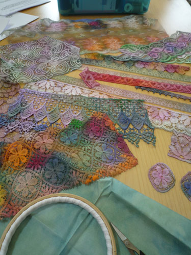 Both me and Mum were supposed to be going on another workshop with Janet Humphrey (who’s just launched her new website), this time on Victoriana. Mum’s had a bad back the last few weeks, but I still made it out there, along with most of the people who were on the Venetian Glory workshop from my last post. This time we’d all brought a selection of lace, and spent the morning dying our lace (and some of Janet’s stash) with silk paints. The weather was gorgeous, so we were able to hang them out to dry while we broke for lunch.
