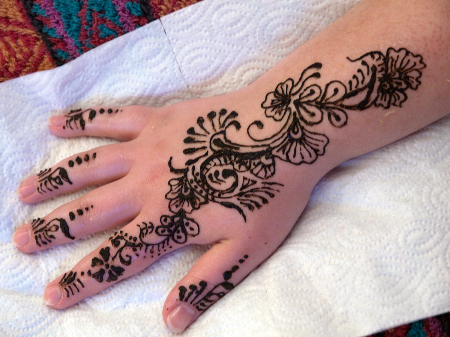 …because my right hand is covered in henna! I really fancied having it done for the Patchings Festival, and we had all the necessary stuff (henna, lemons, etc), so Mum’s just finished doing my hand for me.