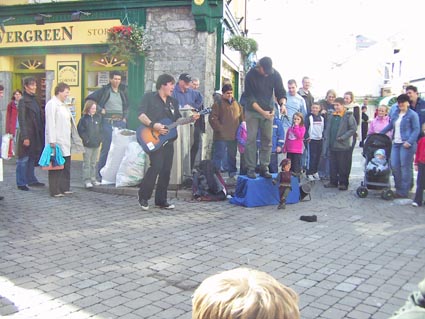 We had a very nice meal in the Latin Quarter, popped into Charlie Byrnes Bookshop and the Galway Bead Shop, ambled around the Saturday Market (where we had fantastic caramelised banana, belgian chocolate and baileys crepes), and generally toured the city centre. It being quite a nice day the buskers were out in force, and these guys were drawing quite a crowd with the mix of guitar, singing, and a marionette dancing and playing around with the spectators.